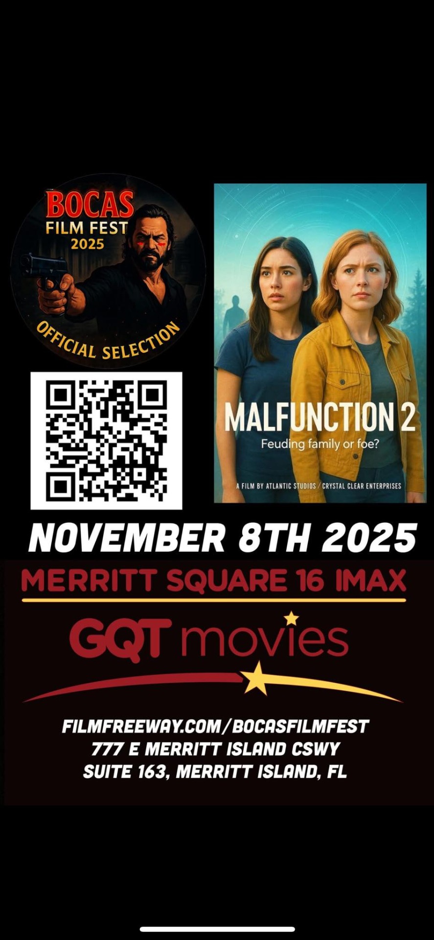 MALFUNCTION 2 HAS BEEN SELECTED AT THE BOCAS FILM FESTIVAL IN MELBOURNE FLORIDA.