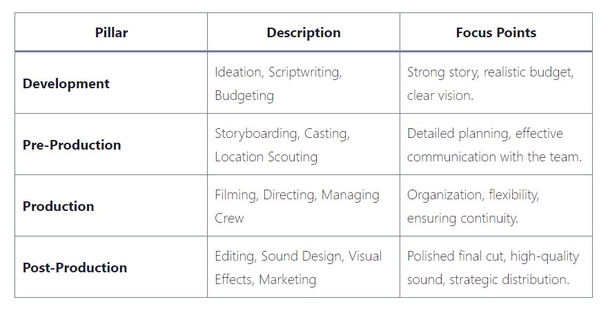 Before you begin your filmmaking journey, it's crucial to familiarize yourself with the four fundamental pillars of the filmmaking process: Ideation, Pre-Production, Production, and Post-Production. Each stage plays a vital role in transforming a mere concept into a compelling visual narrative.